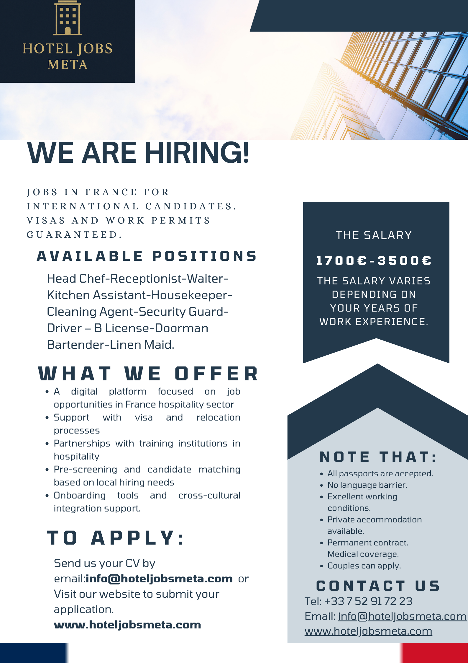 Ne trajtojmë të gjithë procesin e vizave, deri në mbërritjen tuaj në aeroport. Integrimi juaj social dhe profesional është përparësia jonë! Shfrytëzoni këtë mundësi tani dhe jetoni dhe punoni ligjërisht në Evropë. Na kontaktoni në WhatsApp në +33 7 52 91 72 23 ose na dërgoni CV-në tuaj me email: info@hoteljobsmeta.com